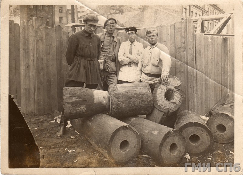 8. Секция деревянного водопровода 18-го века, демонтированная в Ленинграде (Звенигородская улица) при прокладке канализации, на переднем фото трубы осматривает директор Музея истории и развития Ленинграда- Михаил Александрович, фото выполнено 19.06.1941 года, через 3 дня начнется Великая Отечественная.