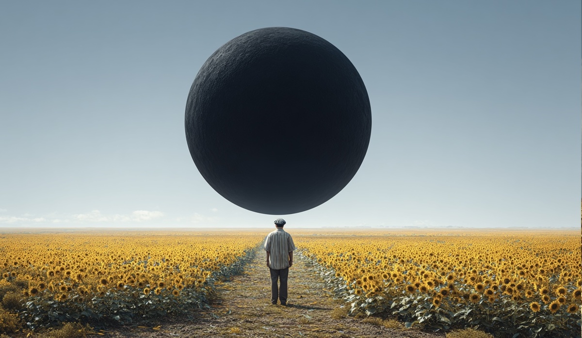 Прямо посреди его поля, в сотне метров, там, где ничего не должно было быть, висел объект. Идеальная, абсолютно чёрная сфера метров двадцати в диаметре. Она не отражала свет, а впитывала его, создавая вокруг себя эффект чёрной дыры в ярком летнем дне. Она не отбрасывала тени и висела в метре над землёй, не приминая ни единого стебля под собой.
